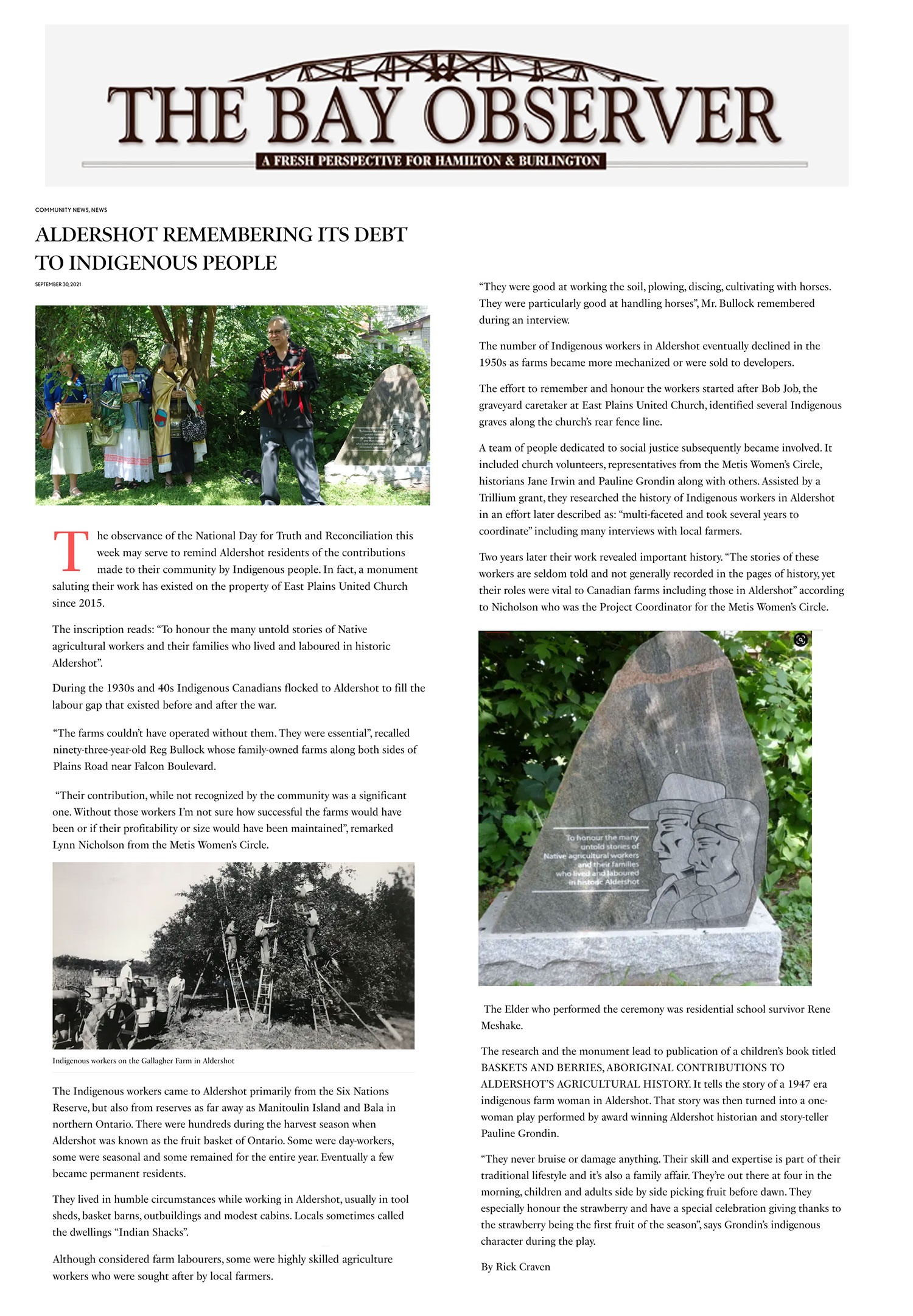 The Bay Observer Article: "The observance of the National Day for Truth and Reconciliation this week may serve to remind Aldershot residents of the contributions made to their community by Indigenous people. In fact, a monument saluting their work has existed on the property of East Plains United Church since 2015.